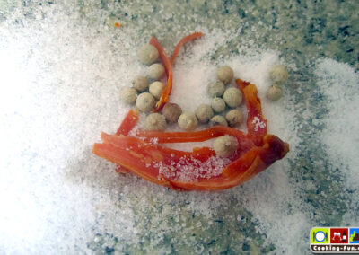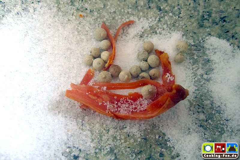Gewürze im Mörser zu Pulver verarbeiten, Butter schmelzen (nicht kochen), Zitrone in Scheiben schneiden und den Bratschlauch so lang abschneiden, dass der längste Spargel reinpasst und an beiden Seiten verschlossen werden kann. Die genaue Benutzung des Bratschlauchs wird auf der Verpackung erklärt, aber ich hab das auch schon auf dieser Website im Rahmen eines Kassler-Bratens vorgestellt.