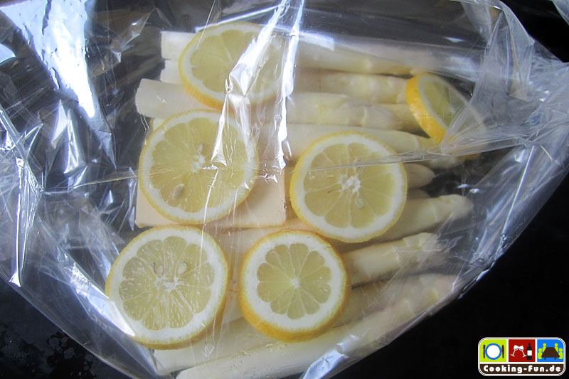 Spargel in den Bratschlauch legen (Schlauchnaht nach oben. Nicht mehr als zwei Lagen, also in ein Paket nur Spargel für zwei Portionen), Gewürze in die flüssige Butter rühren und über den Spargel gießen, die Zitronenscheiben drauflegen und Schlauch verschließen (kleinen Einschnitt oben nicht vergessen).