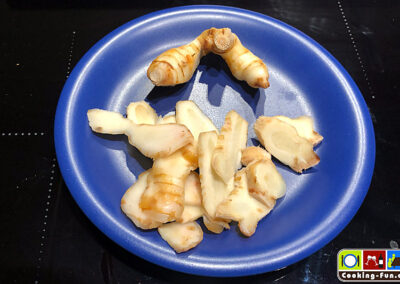 Die Galgantwurzel ist verwand mit dem Ingwer, ist aber deutlich weniger scharf und verleiht einen ganz typischen Geschmack – anders als Ingwer. Er wird zumeist nicht mitgegessen und vor dem Essen wieder entfernt. Galgant wird nachgesagt, er wirke entzündungshemmend und gegen Krämpfe.