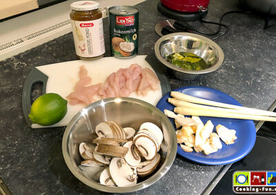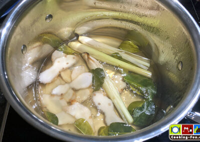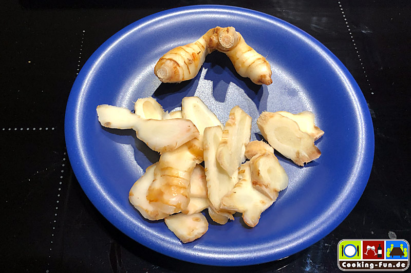 Den Galgant ggf. von Stielen befreien, die Wurzel waschen und in feine Scheiben schneiden. Das Zitronengras abspülen und mit dem Stößel eines Mörsers anknacken (alternativ äußere Blätter entfernen und in 3-5cm Stückchen schneiden). Die frischen Limettenblätter vom Stiel befreien (durch das Anreißen setzen sie ihr Aroma noch besser frei, zudem können Mittelrippe und Stängel einen leicht bitteren Beigeschmack mitbringen), getrocknete Limettenblätter zuvor in wenig lauwarmen Wasser einweichen. Die Chilis kleinschneiden, bzw. getrocknete Chilis mörsern.
