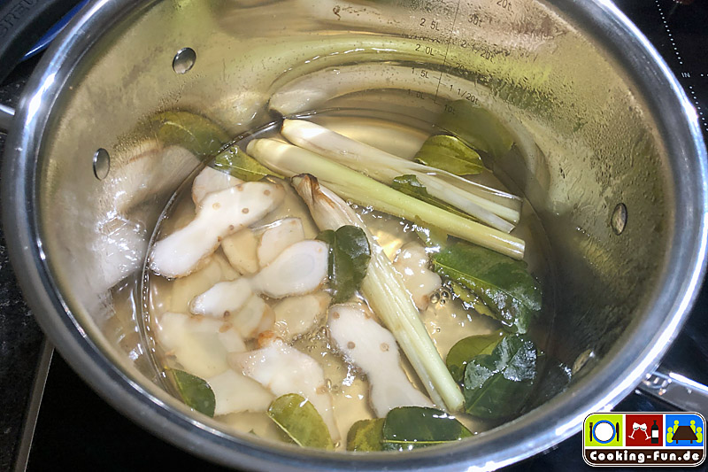Geflügelfond zusammen mit Zitronengras, Galgant und Kaffir-Limettenblättern aufkochen und 10 Minuten leicht köcheln lassen. Durch ein Sieb geben und Zitronengras, Galgant und Limettenblätter so entfernen. Die haben den Geschmack abgegeben und werden nicht mitgegessen. Man kann sie auch im Teebeutel zugeben und braucht sie dann erst zum Schluss entfernen. So können sie noch mehr Aroma abgeben.