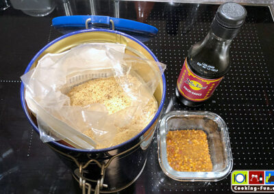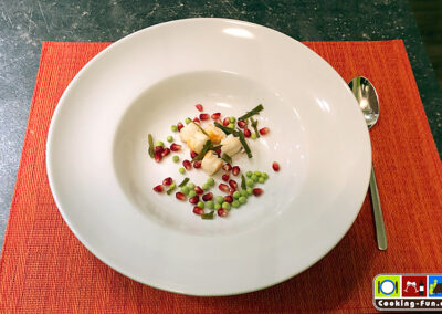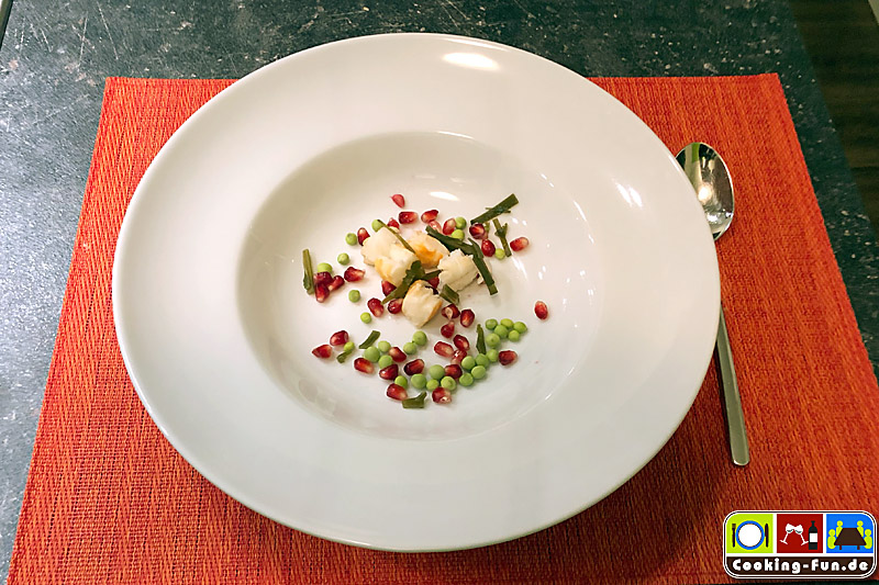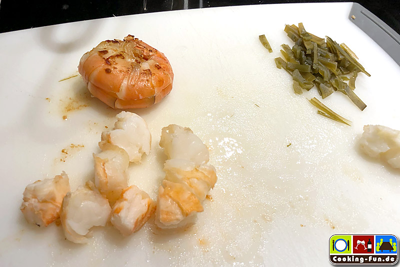 Dazu könnt Ihr sie mit Fleisch von Garnele und/oder Fisch (z.B. Kabeljau), knackigen Zuckererbsen sowie Granatapfelkernen und eventuell ein paar Steifen Wakame Alge servieren (vgl. Titelbild). Diese Interpretation ist der absolute Wahnsinn aus vielschichtigem Geschmack und spannenden Texturen.
