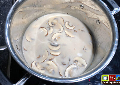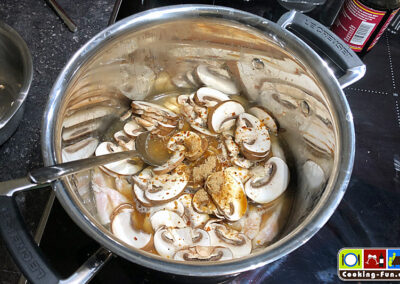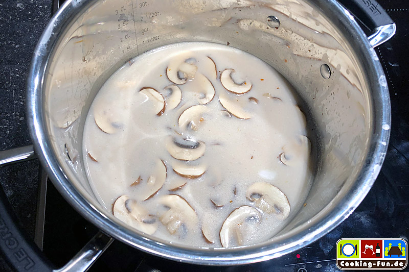 Champignons putzen und in Scheiben schneiden. Hühnerbrust putzen und in gefällige Würfel, Scheibchen oder Streifen (je nach Gusto) schneiden.