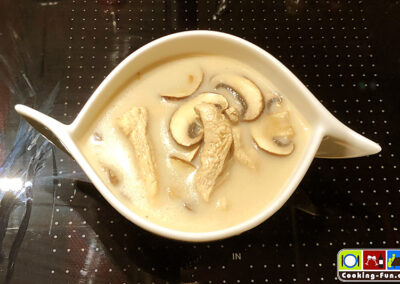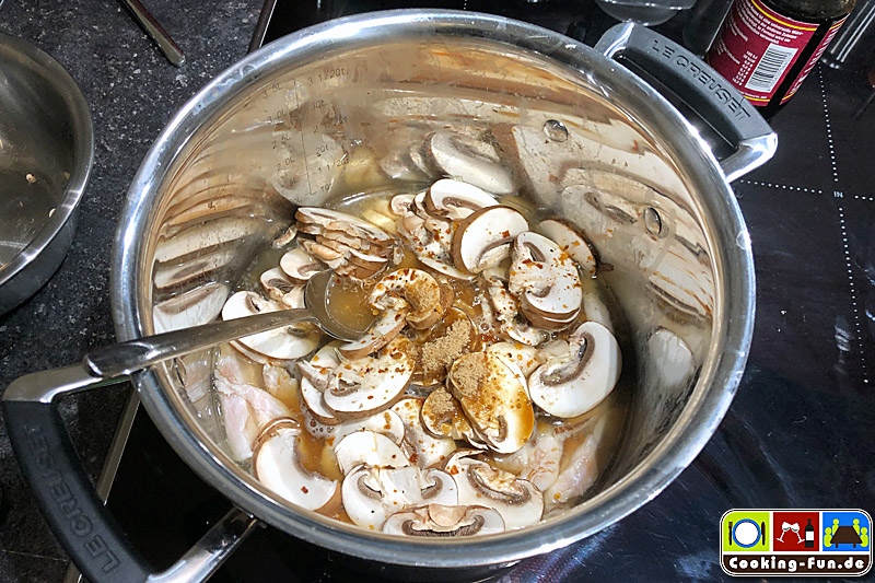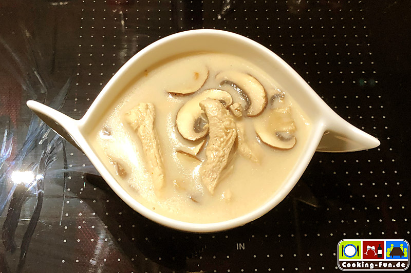 Fleischstückchen und Champignonscheiben sowie je etwas Fischsauce, Palmzucker, Chili und Limettensaft zugeben (abschmecken!) und alles auf reduzierter Temperatur 5-10 Minuten köcheln lassen (Fleisch wird weiß). Eventuelle weitere Einlagen wie Gemüsestifte können jetzt auch hinzu.