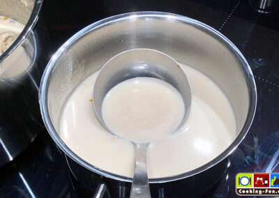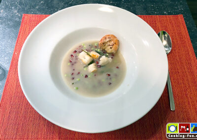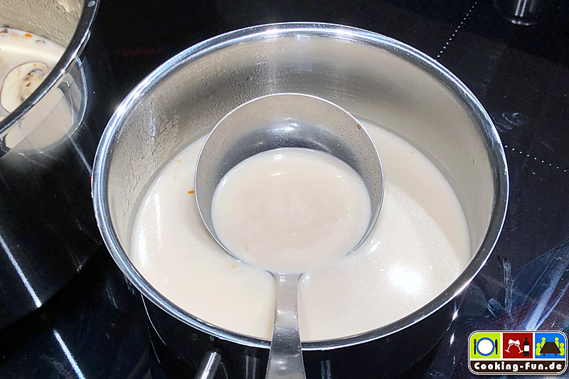Dann die Kokosmilch zugeben, sie sollte nie stark kochen. Alles unter ständigem Rühren erhitzen, aber wie gesagt nicht kochen lassen. Jetzt noch einmal abschmecken (vgl. Geschmacksspektrum oben) und heiß, gegebenenfalls mit etwas fein geschnittener Dekoration servieren.