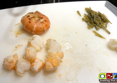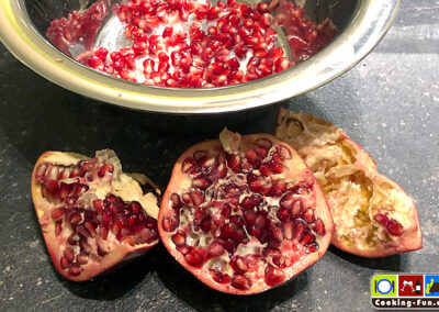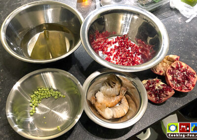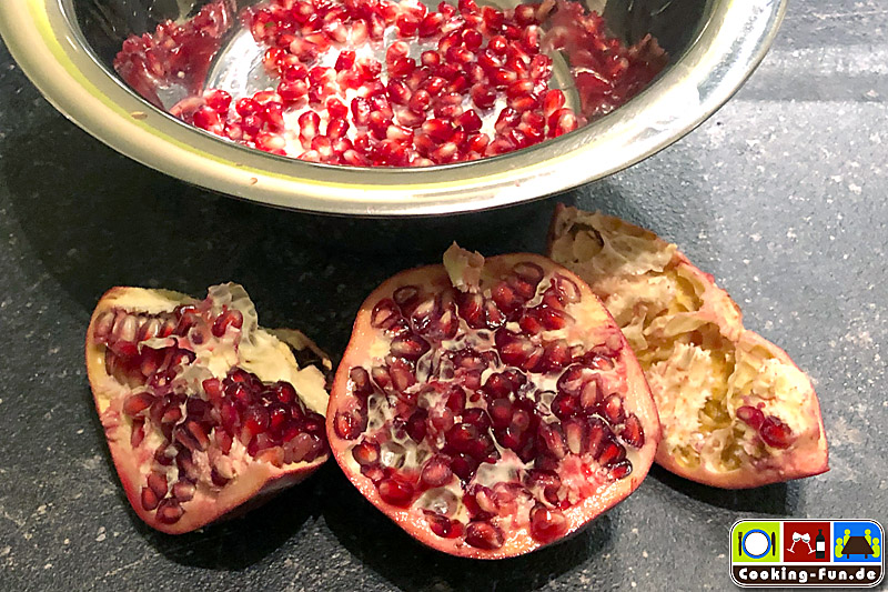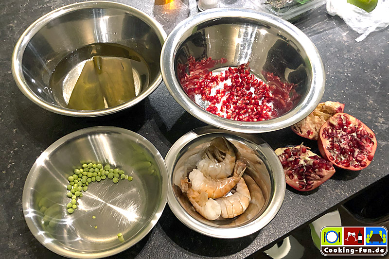 Die Garnelen und ggf. der Fisch werden separat angebraten, die Alge (gibt es hierzulande fast nur in getrockneter Form – ich hatte gerade nur Kombu Alga da, aber Wakame passt besser) einmal abspülen und etwa 15 Minuten in einer Schale mit ausreichend lauwarmen Wasser einweichen, dann in sehr feine Streifen schneiden. Für ein noch leuchtenderes Grün die Alge kurz blanchieren und in Eiswasser abschrecken. Die Zuckererbsen aus der Schote befreien und die Granatapfelkerne aus dem Gehäuse klopfen. Statt Erbsen verwende ich mittlerweile immer öfter Edamame.