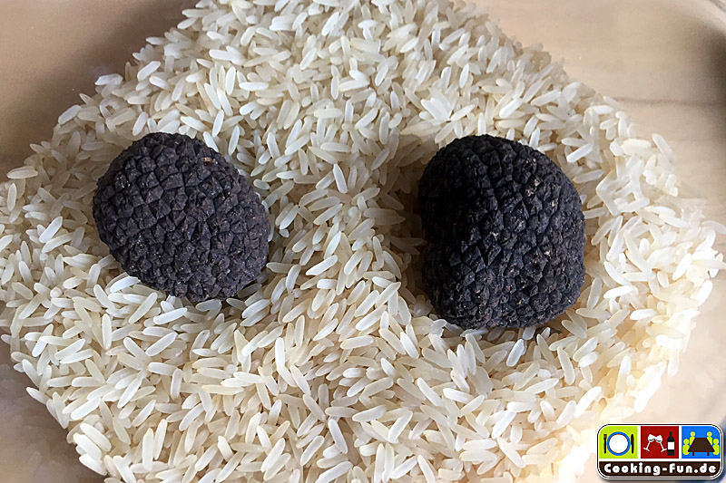 Aufbewahrung: Generell sollten Sie schnell verzehrt werden. Die Trüffeln in einem kleinen, luftdichten Gefäß im kältesten Bereich des Kühlschranks lagern. Als Tipp habe ich bekommen, sie auf ein Bett aus Reis zu setzen, da dieser Feuchtigkeit aufnimmt (Nehmt z.B. Risottoreis und macht mit dem danach ein Risotto, das Trüffelaroma ist klasse). Alternativ geht auch Küchenpapier (regelmäßig wechseln). Bleibt wirklich etwas über, so schneidet den Rest in kleine Würfel und gebt sie in neutrales Öl oder in Butter zur späteren Verwendung.