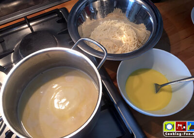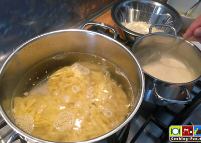 Wenn die Flüssigkeit im großen Topf auf die Hälfte reduziert wurde, die frischen Nudeln kochen und bei der Sauce die Temperatur runterdrehen, dann erst die Nudeln und danach die Eimischung einrühren. Das Ei darf nicht ausflocken (es darf nicht zu heiß sein), es soll die Sauce lediglich etwas binden (legieren). Mit Salz und ggf. etwas weißem Pfeffer abschmecken.