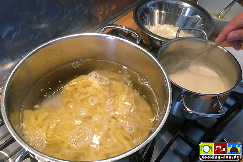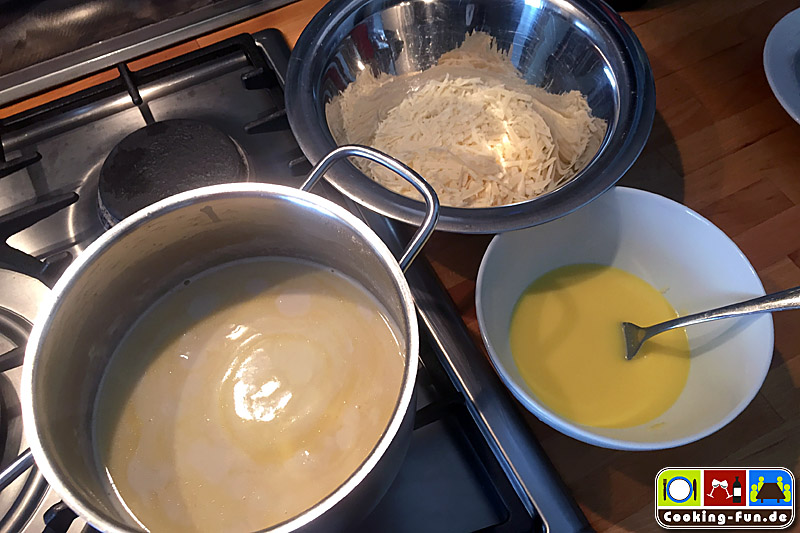Nebenher Salzwasser für die Nudeln aufsetzen. Parmesan fein reiben.