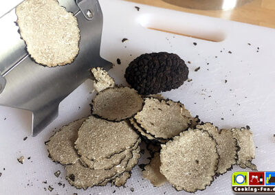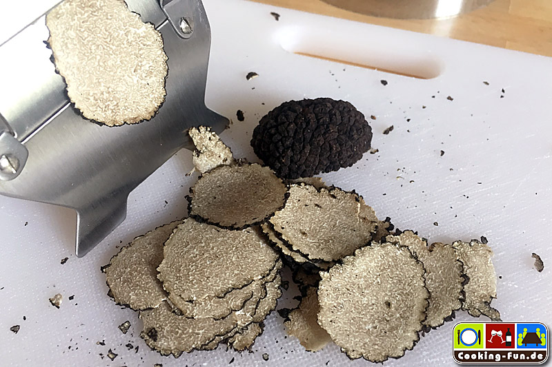 Zubereitung: Trüffeln werden nicht gewaschen oder geschält. Sie werden vorsichtig abgebürstet und dann z.B. über einen dünn eingestellten Hobel gerieben.