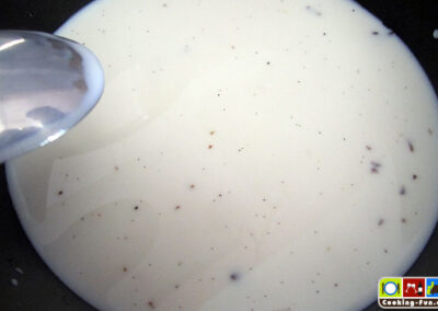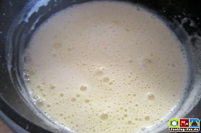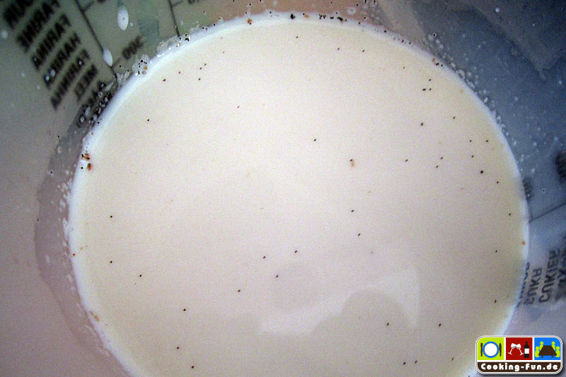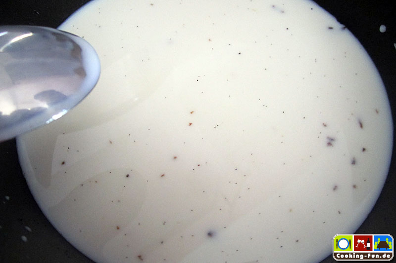 Vanillemark aus der längst aufgeschnittenen Schote kratzen und zusammen mit der Schote in der Milch im Topf aufkochen und 10 Minuten ziehen lassen. Dann durch ein Sieb in ein Gefäß mit Ausgießer umfüllen.