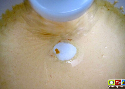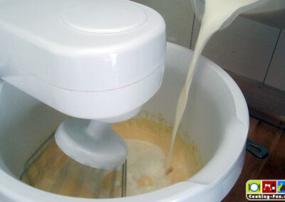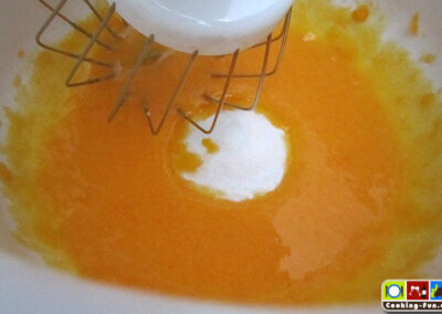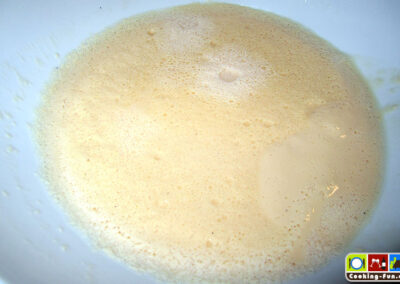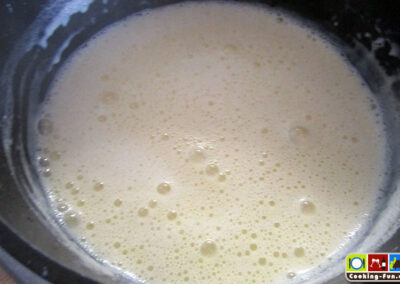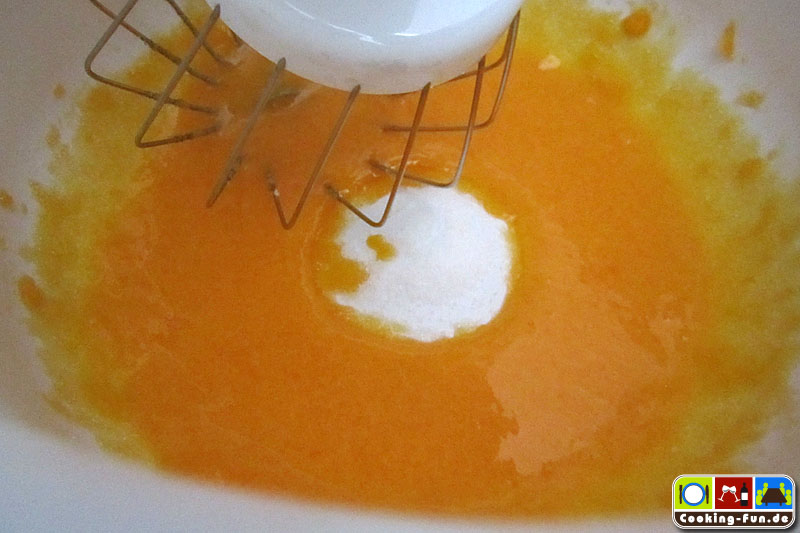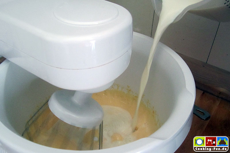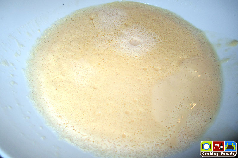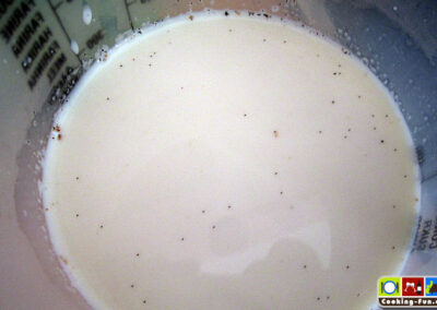 Eigelbe und Zucker in einer Rührschüssel aufschlagen (Schneebesen), bis die Masse dicklich und schaumig ist. Dann langsam die noch warme Milch einrühren (vorher die Schote entfernen).