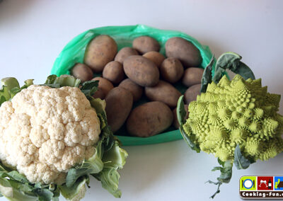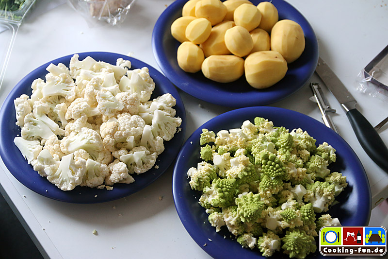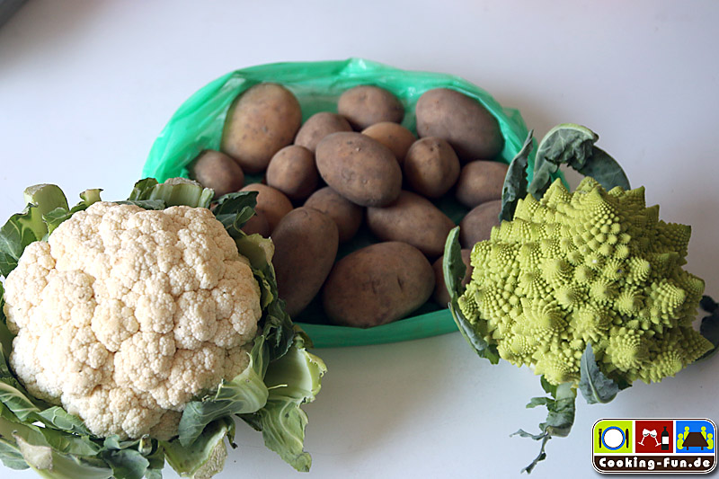 PS: Auf den Bildern haben wir eine knapp doppelte Menge angesetzt und dafür mehr Kartoffeln und zudem für noch mehr Abwechslung einen Romanesco (diese Mischung aus Blumenkohl und Broccoli) verwendet. Er ist aromatisch, dabei aber unaufdringlicher als Blumenkohl. Man bedenke aber, das er mit längerer Garzeit auch immer mehr Kohl-Aroma hervorbringt. Zudem ist er wirklich un-indisch. Schmeckt aber.