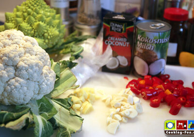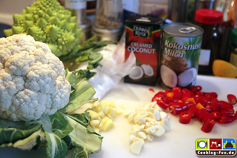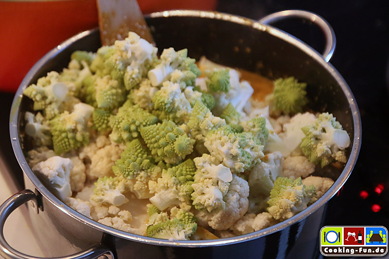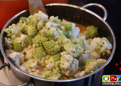 Nun die Kokoscreme einrühren und schmelzen lassen und schließlich die Blumenkohlröschen (und bei uns auch die Romanesco-Röschen) zugeben, vermengen und kochen, bis das Gemüse gar ist. Noch einmal abschmecken (meistens fehlt noch Salz) und schmecken lassen.