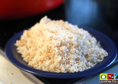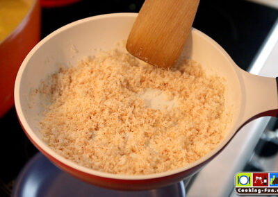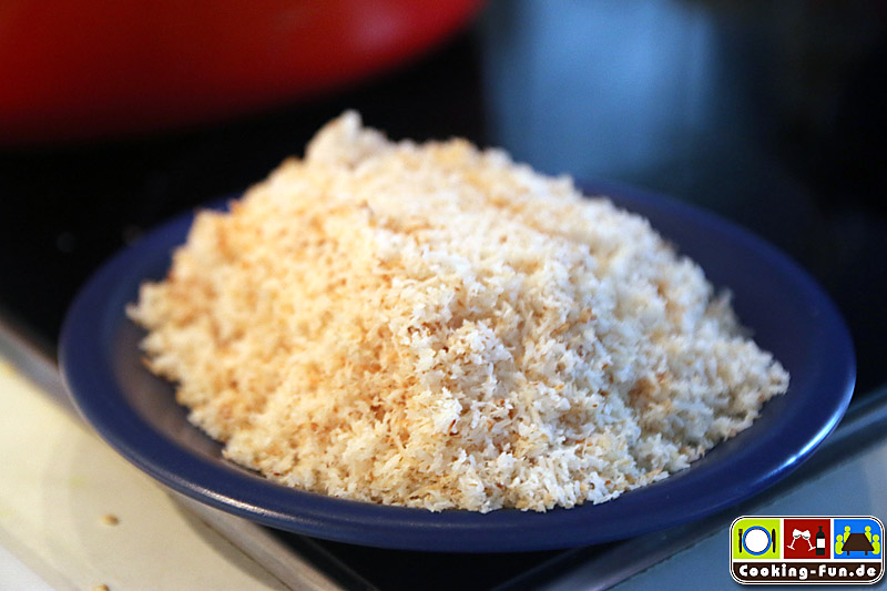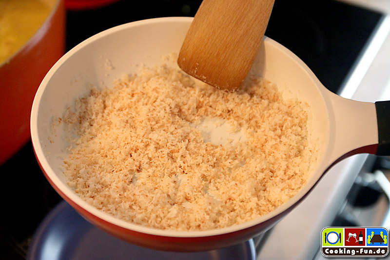 In einer Pfanne mit einem Küchenpapier etwas Öl dünn ausstreichen und die Kokosraspeln darin bei mittlerer Temperatur etwa 5 Minuten rösten. Das sich verbreitende Aroma zeigt an, das man auf dem richtigen Weg ist… Die gerösteten Kokosraspel beiseite stellen.