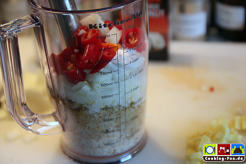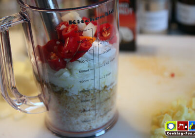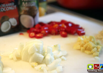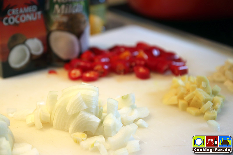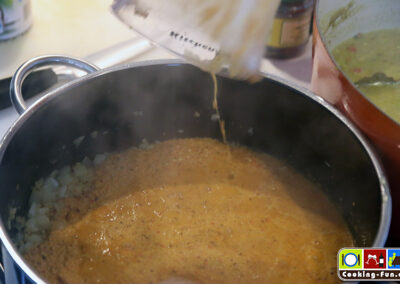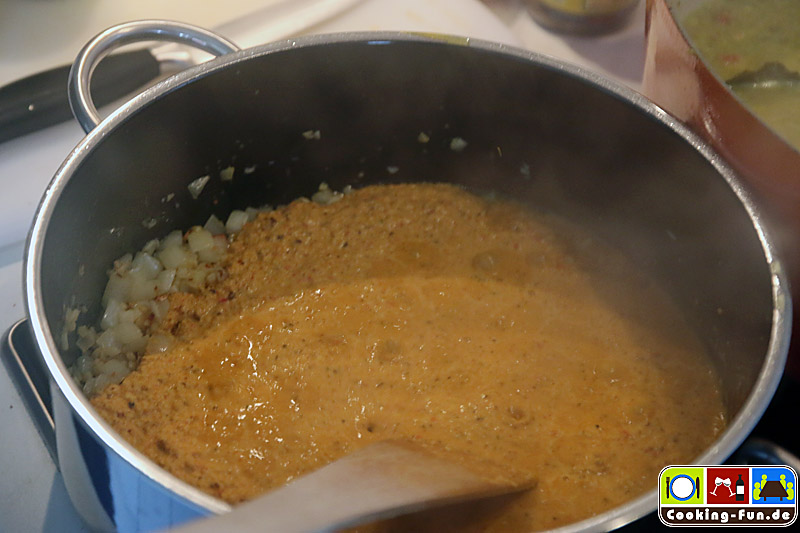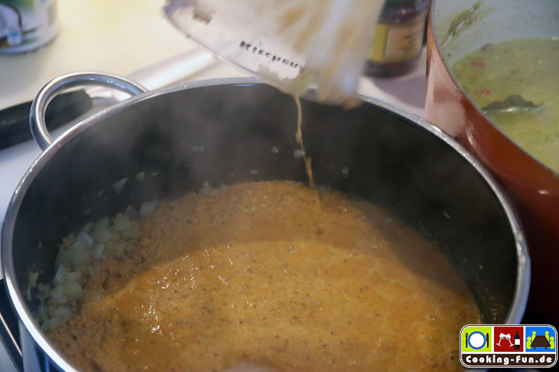Nun brauchen wir einen schweren Topf/Bräter und geben etwas Öl hinein, heitzen ein und schwitzen darin die feinen Würfel von Ingwer, Knoblauch und den restlichen Zwiebeln glasig an. Die Gewürzpaste unterrühren und noch 3 Minuten mitanschwitzen.
