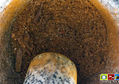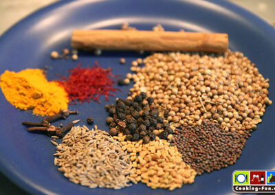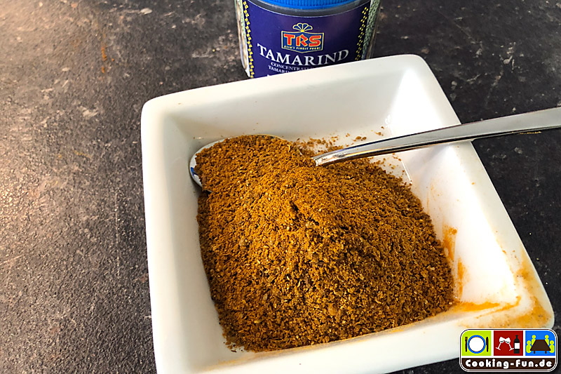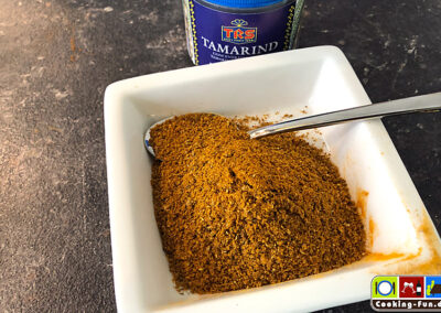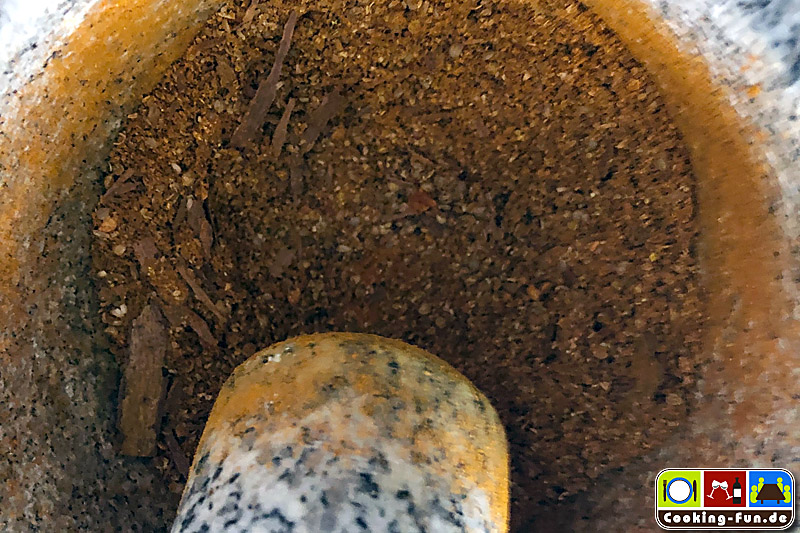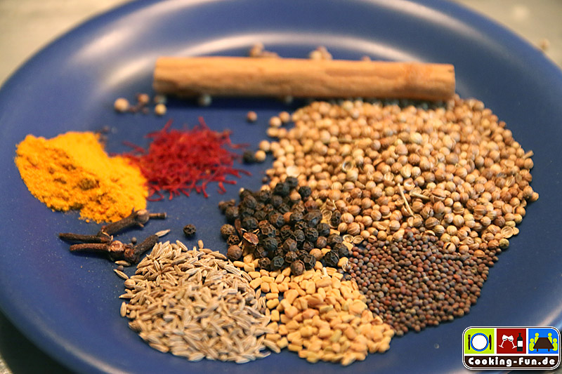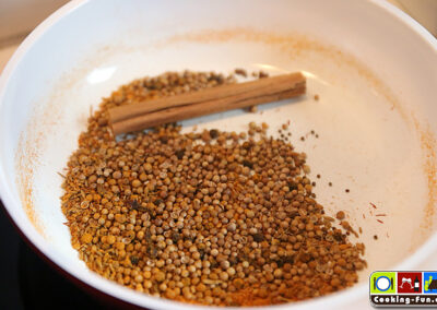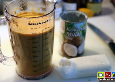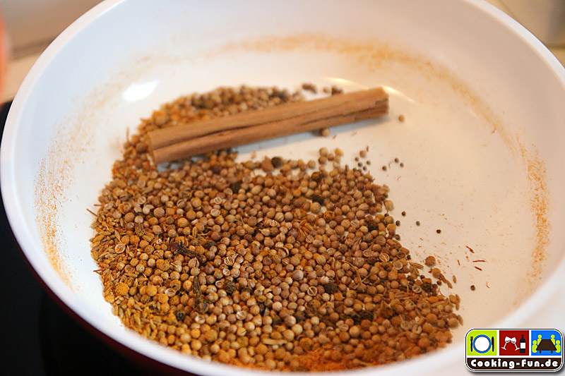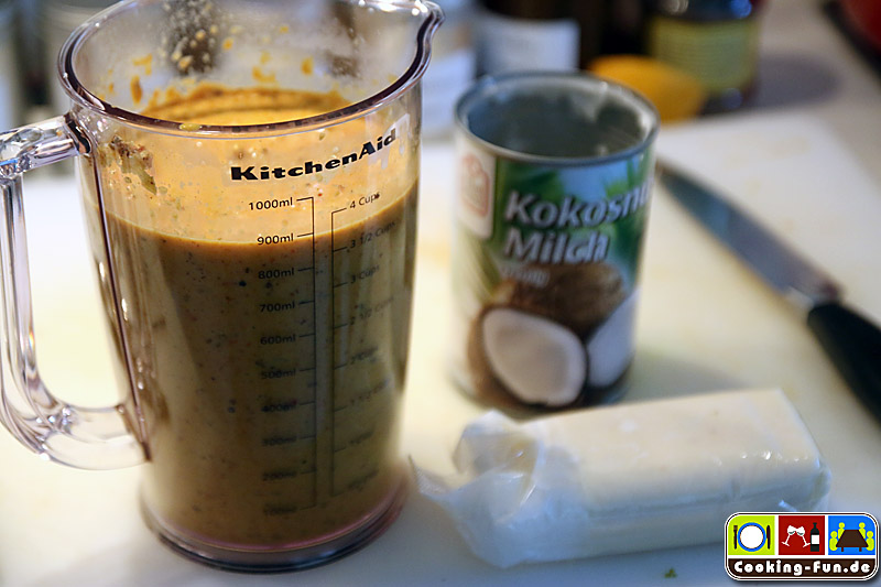 Eine Pfanne, diesmal ohne Öl, anheizen. Hinein kommen die Chilischoten, 30 Sekunden später folgen (in dieser Reihenfolge): Zimtstange, Koriander, Bockshornklee, Nelkeen, Pfefferkörner, Kreuzkümmel und Senfkörner. 20 Sekunden später Kurkuma zugeben. Dabei ständig rühren/bewegen. Nach einer halben Minute die Gewürze aus der Pfanne nehmen und zusammen mit zwei gestrichenen Teelöffeln Salz und dem Safran in einem schweren Mörser zu Pulver zermahlen (ggf. durch ein Sieb geben und die restlichen, groben Stücke nochmals nachmörsern). Nun einen Stand-Mixer nehmen und die gemahlenen Gewürze hineingeben, zusammen mit der bereits angebratenen Hälfte der Zwiebeln, den gerösteten Kokosraspeln, der Tamarinde und etwa 250ml der Kokosmilch (ggf. etwas Wasser zugeben, wenn es im Mixer nicht rundläuft). Alles zu einer glatten Paste verarbeiten.