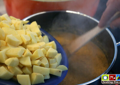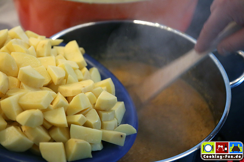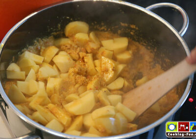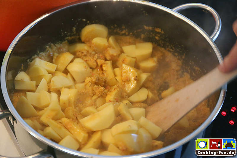 Etwas Wasser sowie die Kartoffeln zugeben und 5 Minuten schmoren lassen. Einen halben Teelöffel Salz, den Rest der Kokosmilch sowie 200-300ml (oder auch mehr – je nach Konsistenz) Wasser zugeben und mit Deckel etwa 7 Minuten köcheln lassen.