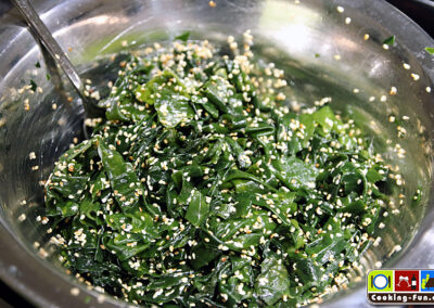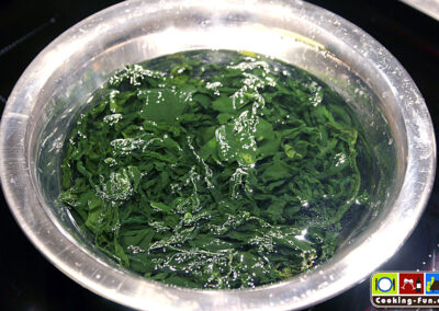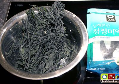 Die Algen gibt es hier wie gesagt nur in getrockneter Form und müssen eingeweicht werden. Also spült sie einmal kurz ab und legt sie dann für etwa 15 Minuten in eine Schale mit ausreichend lauwarmen Wasser, dabei vergrößern sie ihr Volumen auf etwa das dreifache und die grüne Farbe kommt wieder zum Vorschein. Dann gießt ihr das Einweichwasser weg, spült die Alge nochmals mit frischem Wasser ab und drückt sie behutsam aber kräftig aus, um überschüssiges Wasser zu entfernen (sonst verwässert der Salat und das Dressing haftet nicht so gut an).