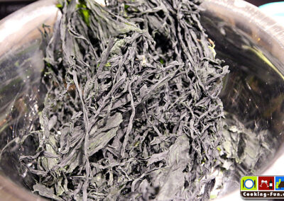 Wakame (oder wie ich sagen würde wenn ich Botaniker wäre: Undaria pinnatifida) ist eine Braunalgenart aus der Ordnung der Laminariales, die vor Japan, Korea und China gedeiht. Auch in Frankreich wird sie schon in Unterwasserfarmen angebaut. Hierzulande werden die fleischigen Blätter in getrockneter Form angeboten und da sehen sie nicht gerade wie eine leckere Speise aus. In Japan werden auch die besonders nährstoffreichen Wurzeln (Makabu) angeboten und verzehrt.