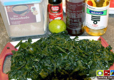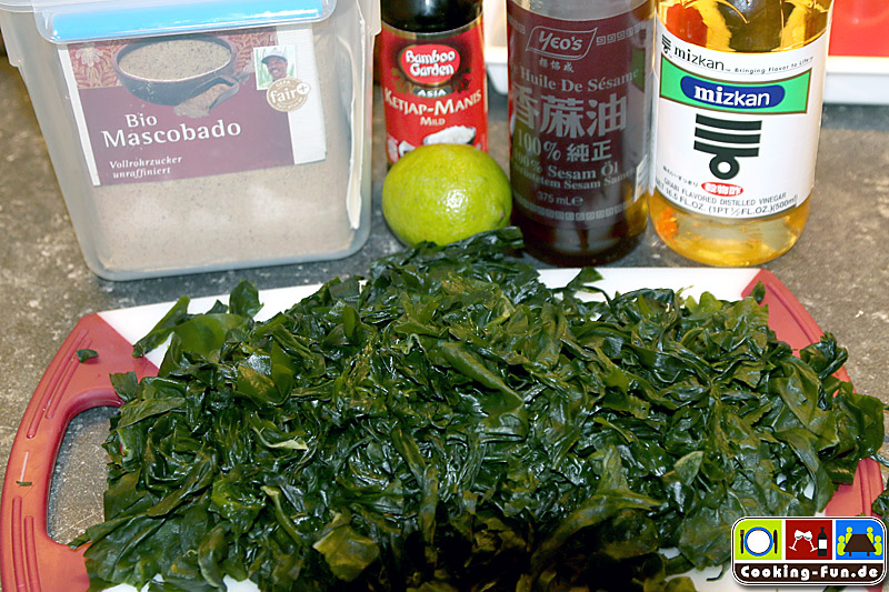 Aus Sesamöl, Reisessig, Ketjap Manis (oder milde, helle Sojasauce), Rohrzucker und Limettensaft wird nun das Dressing gemischt (Abschmecken nicht vergessen, es soll eine schöne Balance aus Süße und Säure mit einem Aroma von Sesam erreicht werden). Das Dressing mit den Algen vermengen.