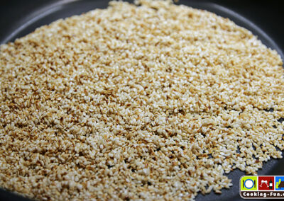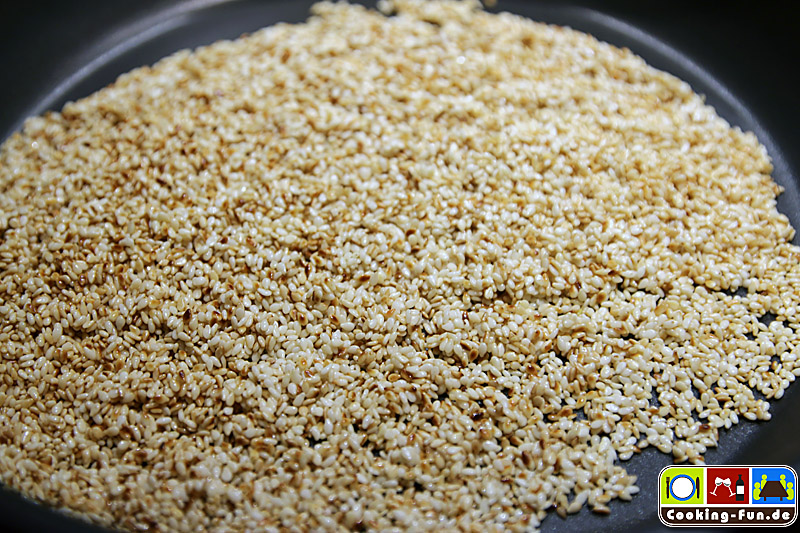 Die Sesamsaat kurz fettlos in einer Pfanne anrösten, bis die ersten Körnchen anfangen zu springen, dann über den Salat streuen.